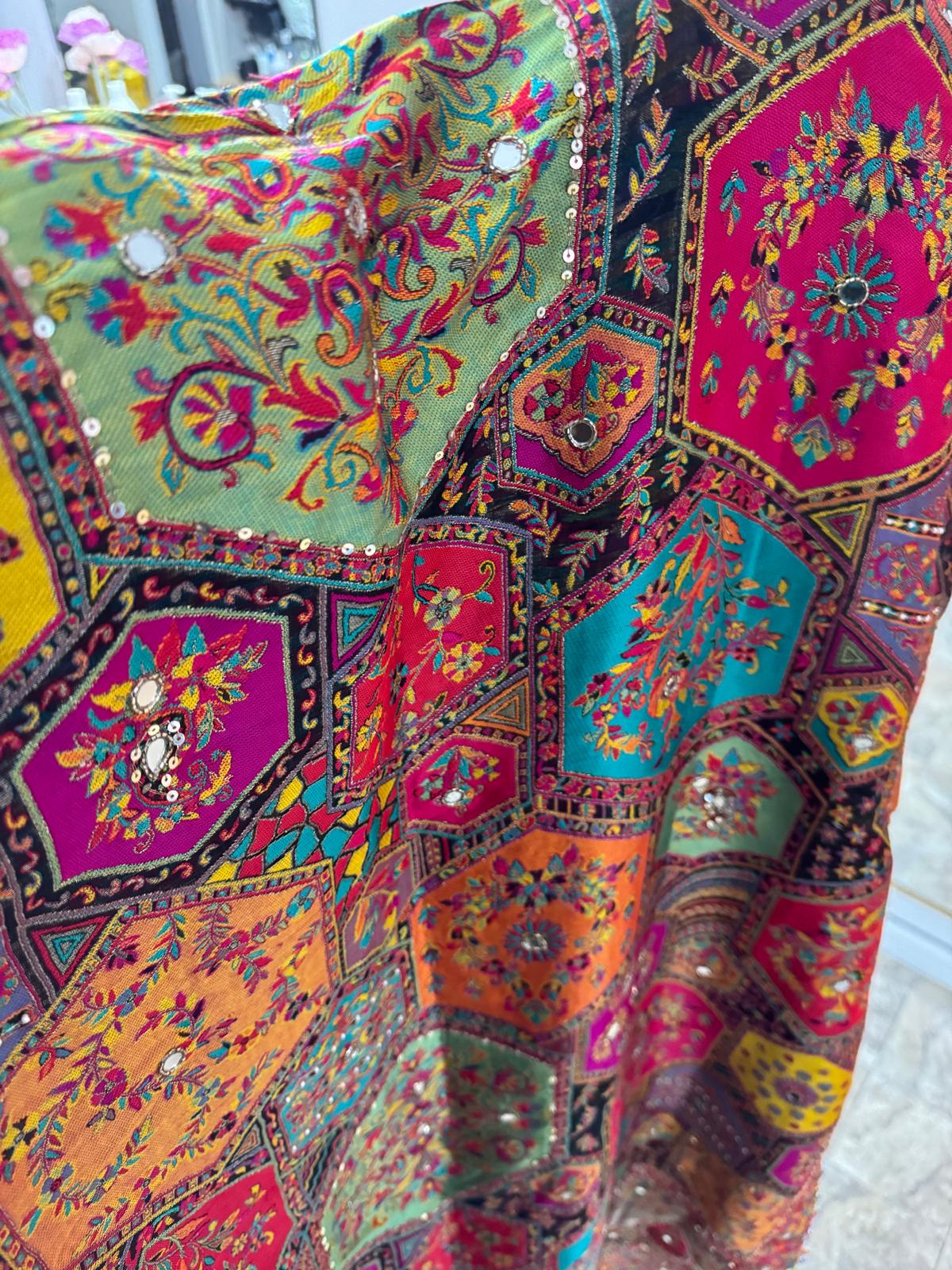Fabric- crape silk with handwork embroidery. Color – black Dupatta – multi color with embellishments as shown in pictures .