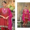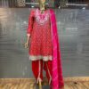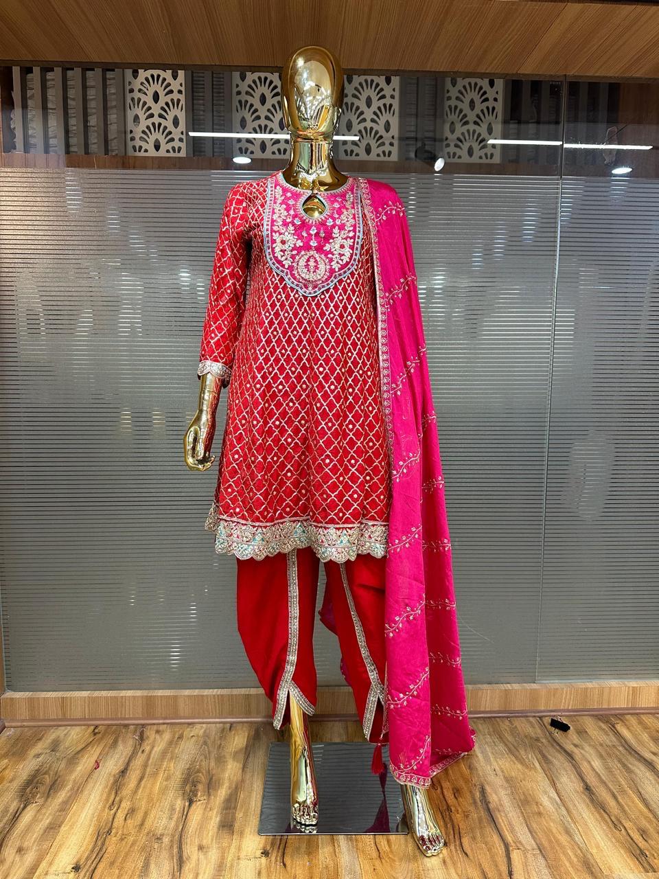 Top-Chinon with emboidery ( front & backwork) length -36 Duppta- Chinon with embroidery Dhoti- chinon Color- Majentha/Red or Hot Pink Red as shown in picture